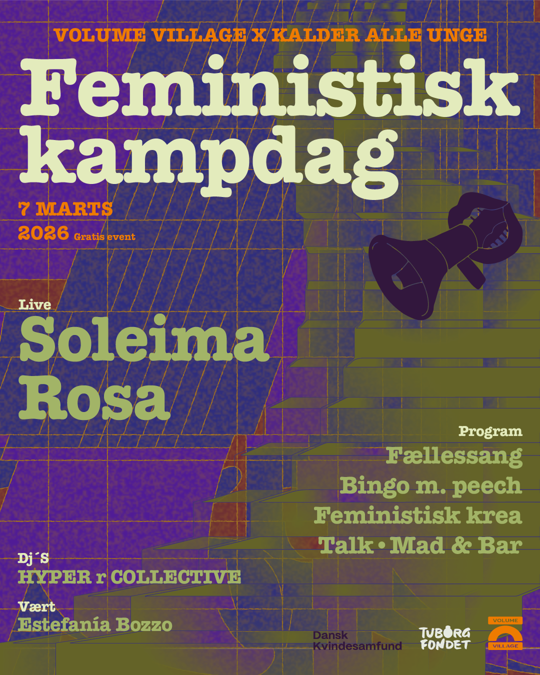 KALDER ALLE UNGE x Volume Village inviterer til Feministisk kampdag, lørdag d. 7. marts i Volume Village - Gratis entre. Vi hylder fremskridt og sætter spot på de rettigheder, der fortsat er underpres. Vi gør det med talks, musik, kreativitet og fællesskab. <3